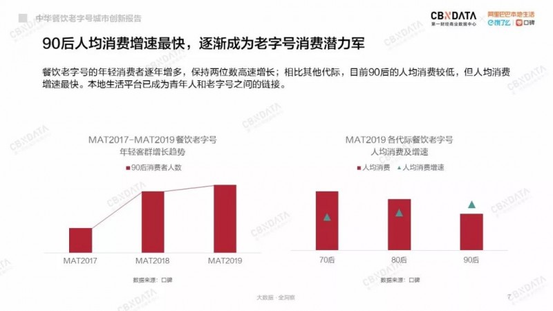 1)近两年间,餐饮老字号的90后年轻消费群体逐年增多,且人均消费增速最快;