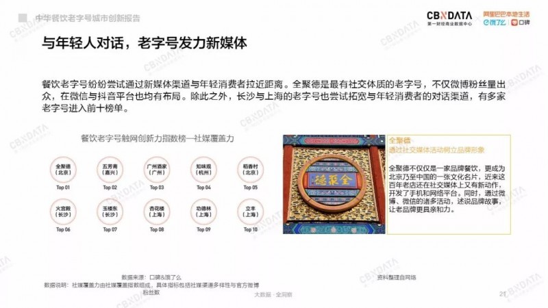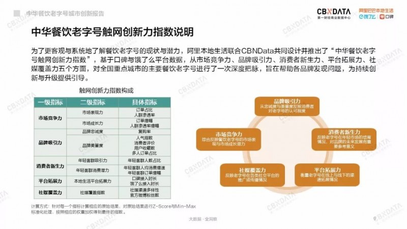 基于以上国内餐饮老字号的市场发展概况,CBNData《报告》将根据“中华餐饮老字号触网创新力指数榜”的各项指数,剖析各大餐饮老字号的创新与发展状况。