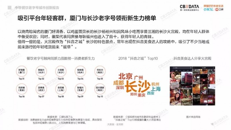 对不少年轻人来说,游玩攻略中提到的“老字号”美食已然成为旅行最大的吸引力,有种草有拔草,一趟旅行才算圆满。从消费者新生力指标的TOP10来看,厦门好清香位居榜首,长沙、南京、芜湖三座城市最受年轻吃货的欢迎,均有两家餐饮老字号上榜。并且,舍得为网红美食一掷“青春”的年轻人,也开始通过“老字号”营造节日的仪式感。