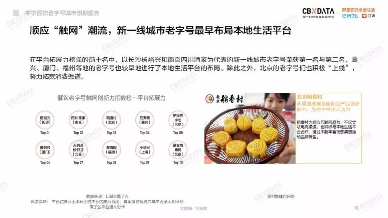 在平台拓展力榜单的前十名中,桂冠由来自长沙的杨裕兴摘得;北京则有四家老字号上榜,早早布局了本地生活平台,努力拓宽消费渠道,北京老字号可以说是“触网”先驱者。以稻香村为代表的北京老字号,他们的多渠道发展策略配合产品创新能力,为老字号注入活力。稻香村为顺应互联网趋势,不仅尝试电商渠道,也积极与本地生活平台合作,通过不断丰富销售渠道推动品牌转型。