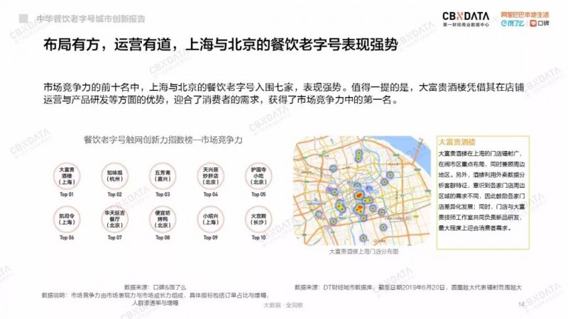 据CBNData《报告》显示,在基于口碑和饿了么双平台数据的“中华餐饮老字号触网创新力指数榜”中,并未进入TOP10的上海大富贵酒楼,在市场竞争力和品牌吸引力两项指数上却是问鼎第一,可见其在本地餐饮市场的覆盖率之高,回头客之多。虽然大富贵不是最早“触网”的老字号,但却是本地一家非常与时俱进的老字号。