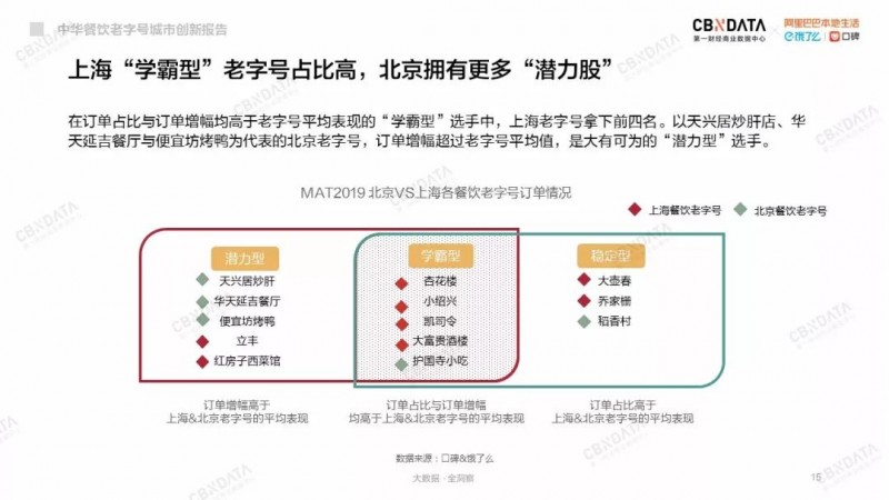 天兴居炒肝为代表的北京老字号订单占比超过平均值,属于学霸选手中的“潜力股”,仍有上升空间。上海老字号在订单占比与订单增幅上表现均十分优秀,其中有一位隐形学霸不得不关注,它就是“上海大富贵酒楼”。