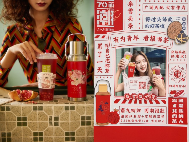 同一天,奈雪的茶官方微博宣布联名「人民日报」,推出国潮茶饮「报款红石榴」,粉丝可以到线下门店与「奈雪×人民日报」立牌合拍,带上话题发微博,就能获赠报款红石榴的免费券。