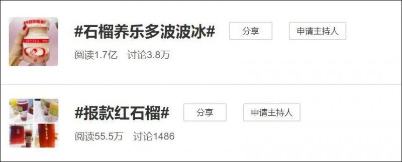 被大罐养乐多吸引,应该也是多数人的感受。微博话题「喜茶×养乐多」阅读量接近1200万,讨论3万条,话题「石榴养乐多波波冰」阅读量甚至高达1.7亿!反观奈雪,「报款红石榴」话题的阅读仅有55.5万,讨论才1486条。