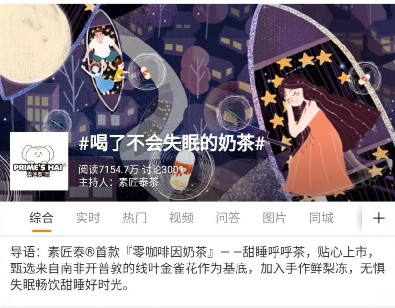 昨天,微博热搜排行榜上一条关于“喝了不会失眠的奶茶”的话题引起了我们的关注,点击进入界面,阅读量超7000万,讨论接近3000条,时隔近1年,有些安静的素匠泰茶用一款新品再次引起了社会及行业的热议。