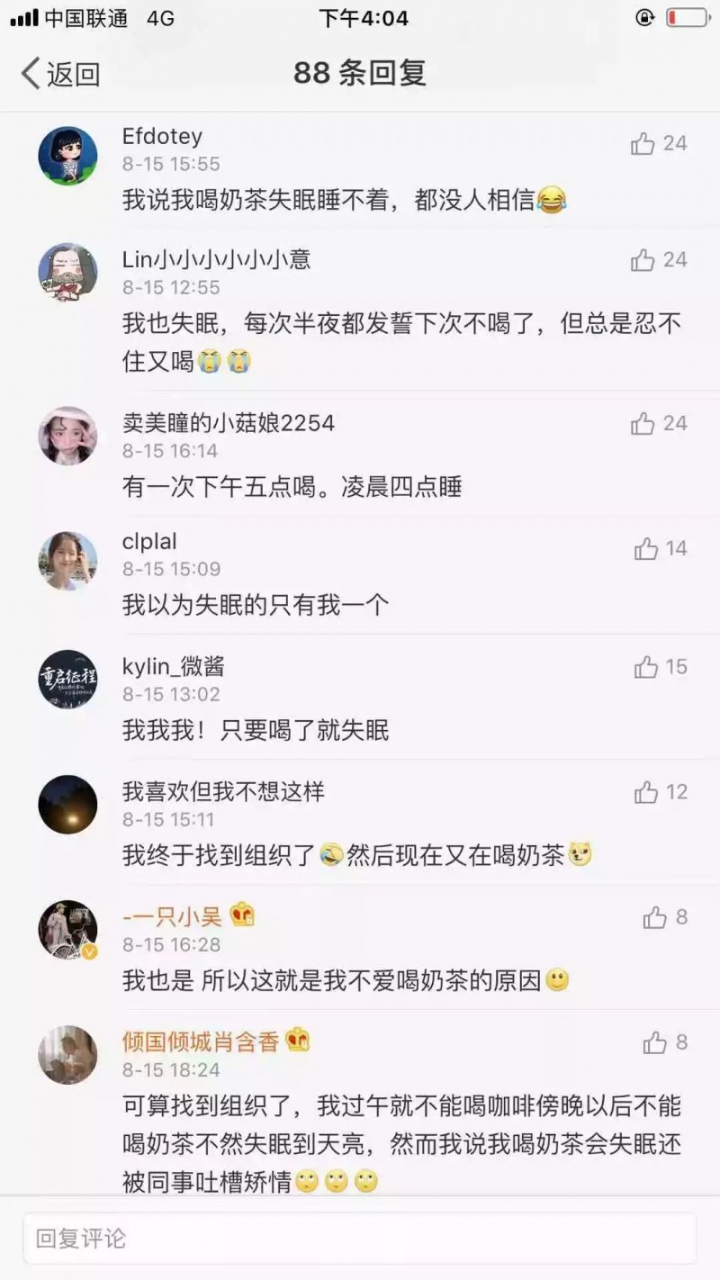 官方微博下,关于各种吐槽喝了奶茶睡不着,急需这样的饮品,失眠星人的福音,什么时候上市,哪里可以买到等留言比比皆是,让我们看到奶茶的另一种形态—功能奶茶的流行,或将又是一种趋势。