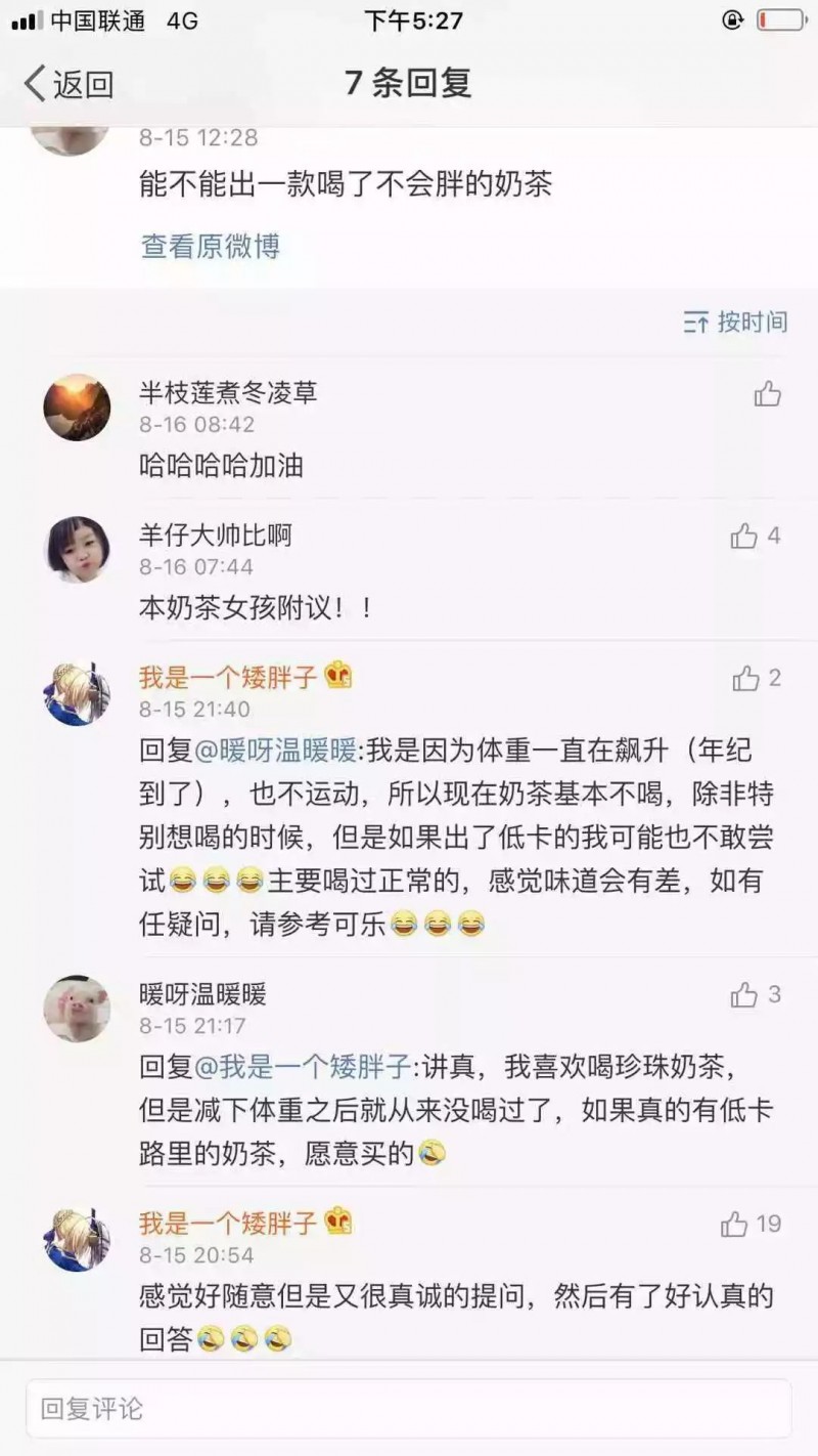 此次热搜获得众多消费者的共鸣,给了素匠泰茶研发团队很大的信心。与此同时,官方微博下“能不能出一款喝了不会胖的奶茶”、“啥时候出零热量的”、“我不怕失眠,我怕肥”等等留言引起众多网友转发,团队负责人笑言,她们下次的研发目标可能是:喝了不会发胖的奶茶。