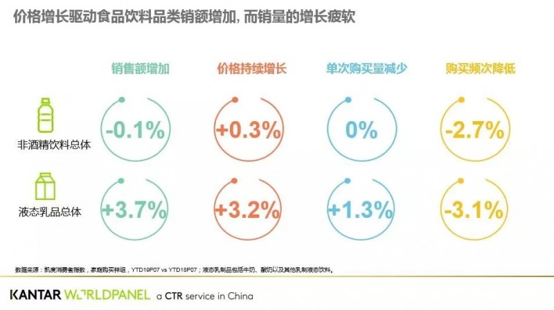 根据凯度消费者指数数据监测显示,截止当前2019年中国快消品销售额增长率为4.7%,其中食品板块增长1.9%、非酒精饮料和液态乳制品增长2.5%。