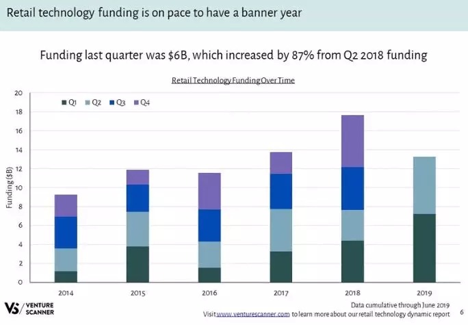 Venture Scanner 近日发布了关于全球零售科技行业2019年第二季度表现的报告。Venture Scanner 数据库收录了全球近 2000 家零售科技初创企业。在 2019 年第二季度,零售科技公司共计融资额为 60 亿美元。