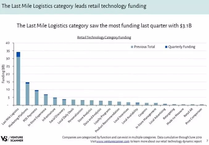 与 2018 年第二季度相比,零售科技行业融资金额上升了 87%。而在众多的零售科技细分领域中,最火热的是“最后一英里”配送有关的企业,排名第二的是“营销平台”类企业,排名第三的是“POS支付”类的企业。