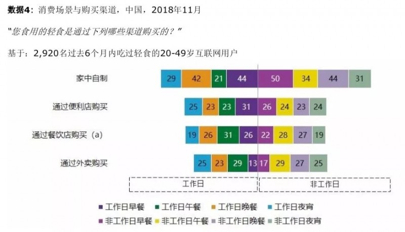 另外,约有三分之一(31%)的轻食消费者表示他们会从餐饮店购买工作日午餐;高于包括通过外卖购买(29%)、通过便利店购买(23%)或那些在家中自制轻食(21%)的消费者。