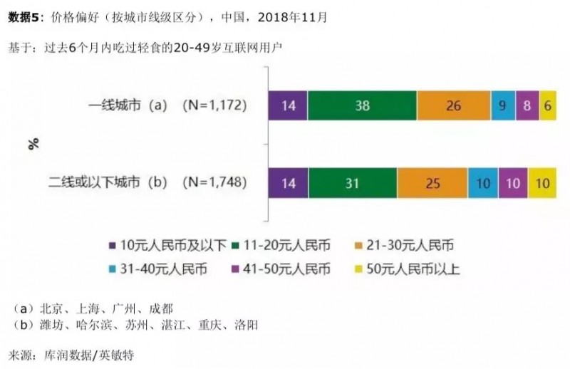 沙拉供应商可以更多关注北部和东部地区,尤其是竞争不那么激烈的低线城市。另外,低线城市消费者的价格接受度较高,平均每餐轻食的消费高于一线城市消费者。