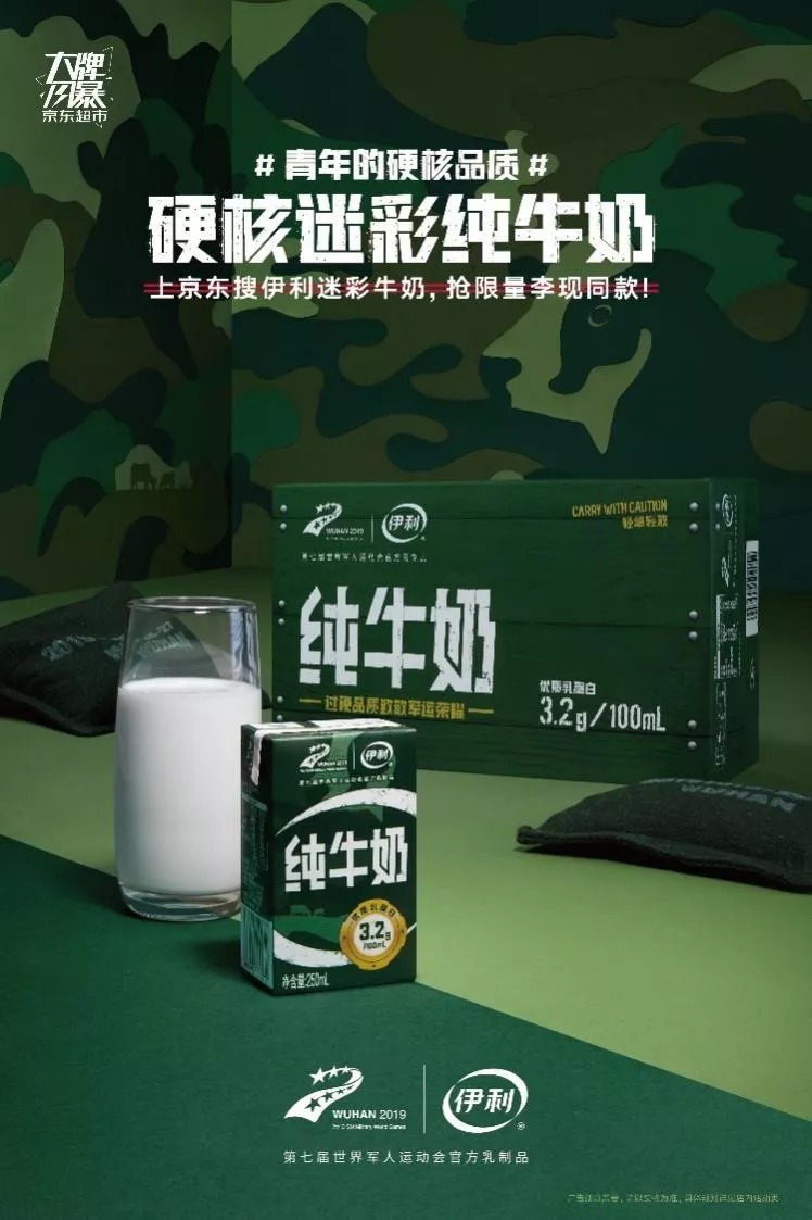 近日,伊利纯牛奶穿上了“迷彩”外衣,时尚新装吸引了我们的注意。作为将于10月在武汉举办的第七届世界军人运动会的唯一官方乳制品品牌,同时借由10月“北阅兵,南军运”背景,伊利此次创造性地围绕“硬核青年”,结合目标消费群体与军运会在品质特征上的共性,通过产品及品牌主张与年轻消费者进行沟通。据了解,迷彩装纯牛奶已于今日限量登陆京东超市大牌风暴。