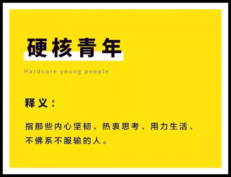 硬核(hardcore)可以追溯到70年代在英美兴起的朋克音乐流派,原本形容音乐和游戏猛烈强劲的力量感。推而广之,硬核概念很快便延伸到各个领域。其中,硬核青年是指那些不要被定义,不随波逐流,积极向上,坚定的活出自己的态度。