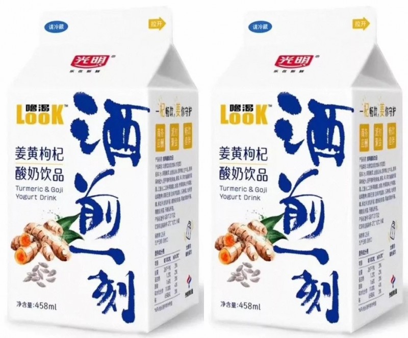 光明LOOK系列是由光明乳业在2017年推出的一款主打餐饮渠道的酸奶饮品,产品专为餐前酒后的消费场景而研制。近日,光明LOOK系列再推新,上线了一款姜黄枸杞酸奶,名为“酒前一刻”。
