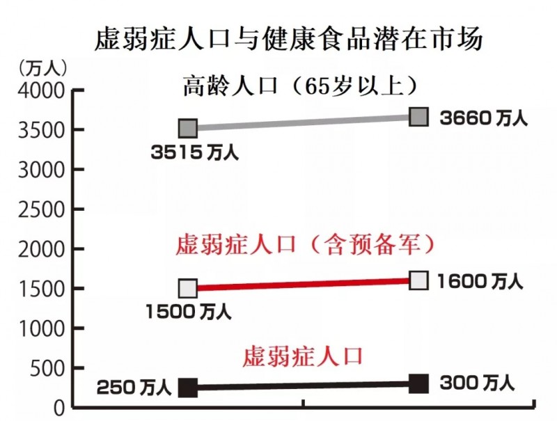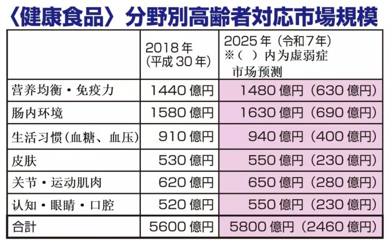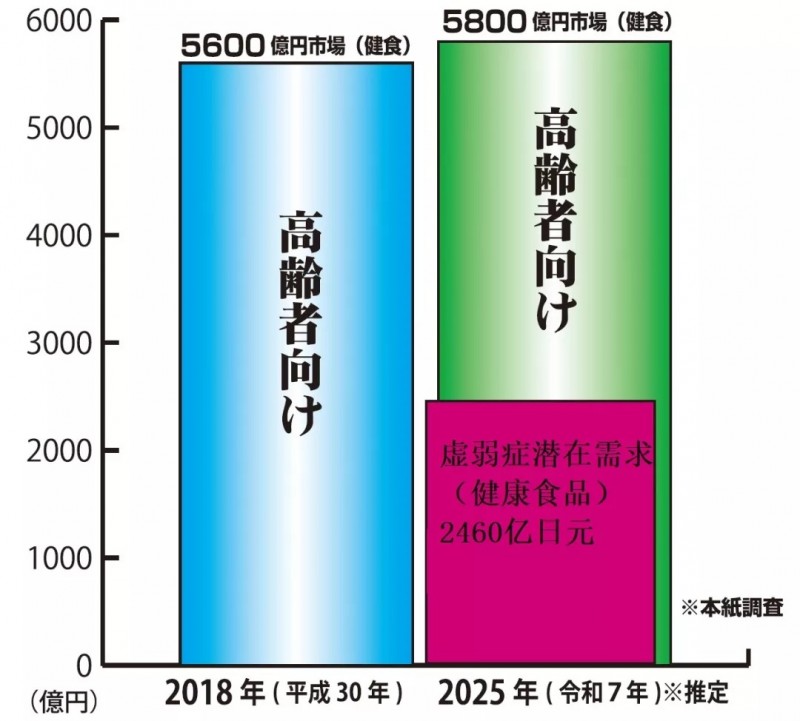 2025年老年健康食品市场预测将达到5800亿日元,虚弱症的潜在市场为2460亿日元。