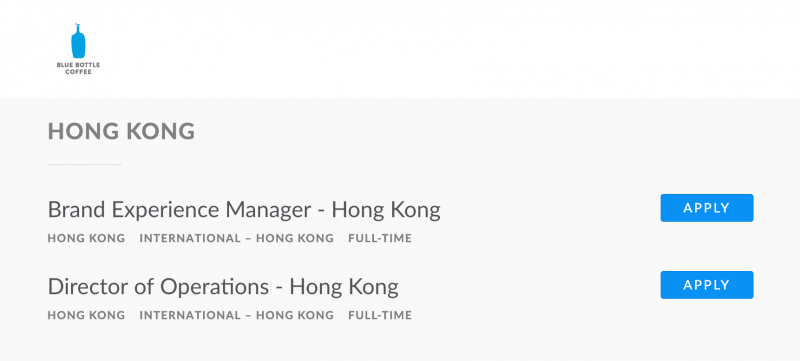 小分队线人多那是出了名的!正是我们的一位粉丝发现,在Blue Bottle Coffee官网上,正在招募香港地区的运营总监和品牌经理2个职位。