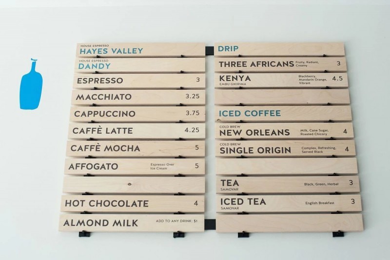 另一点特色就是Blue Bottle超精简的菜单了。跟星巴克各种眼花缭乱的咖啡、星冰乐、奶昔、果汁等不同,Blue Bottle坚持纯咖啡菜单。