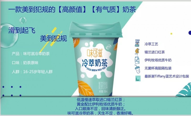 在选材上,味可滋新推出的冷萃奶茶甄选锡兰进口红茶,黄金配比伊利牧场优质牛奶;在口感上,入口顺滑不涩,回味清新醇正;在工艺上,采用行业领先的冷萃技术,为产品的卓越品质和美妙口感保驾护航;在包装上,无菌包高阻隔包装做到了安全性和美观度的兼得,再加上独特新潮蓝专属设计,给人一种强烈的品质感和潮流范。