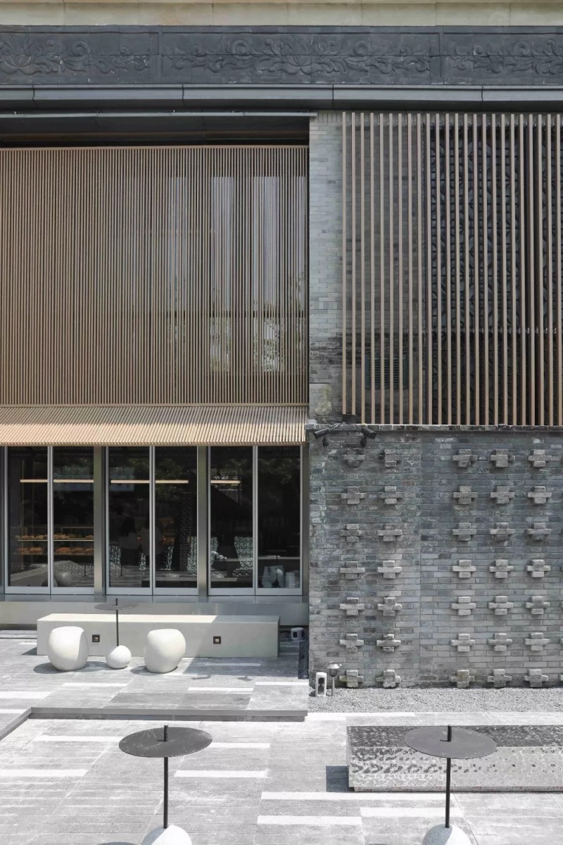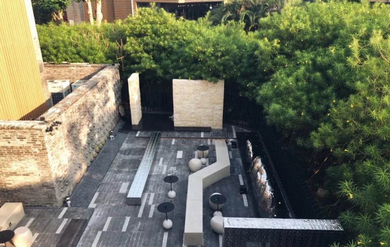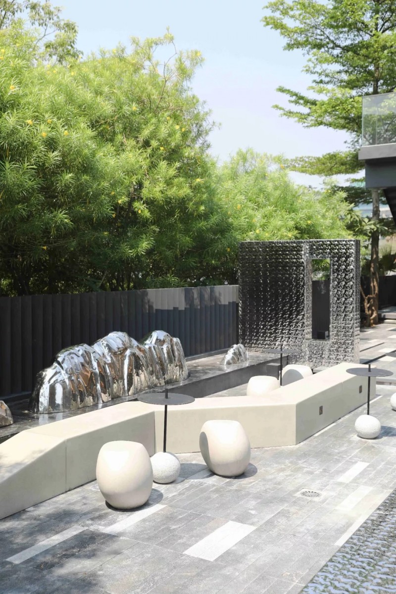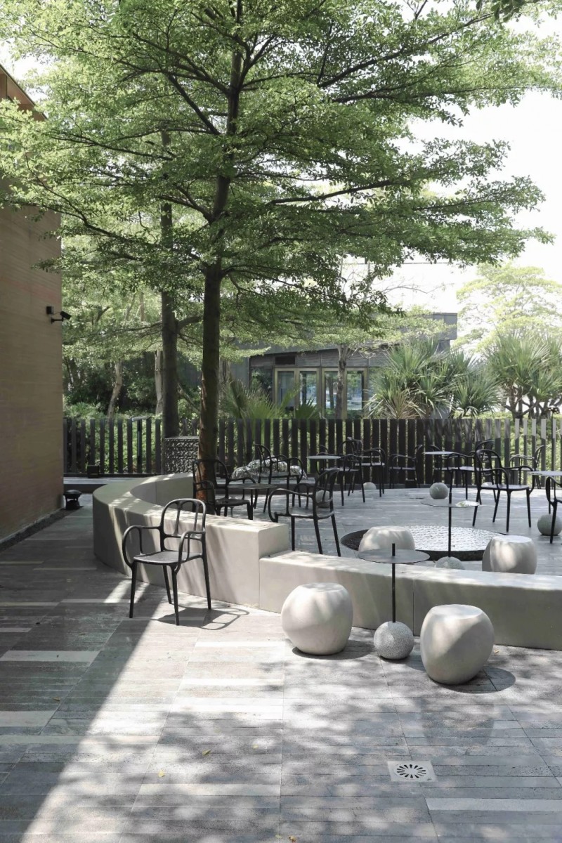 此次设计亮点不可忽略室外自由布局的游廊庭院,淋漓尽致地表达现代灵感与传统文化,依靠深圳欢乐海岸项目的湖景、镜面与路旁树影形成了虚实景观。