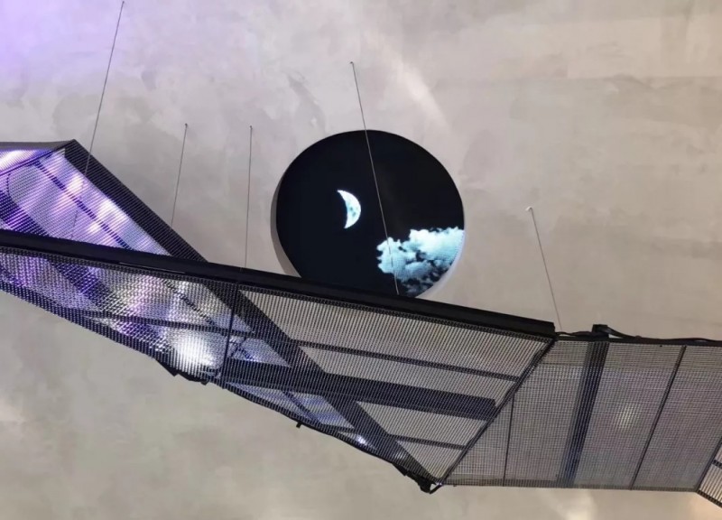 室内设计亦有很多巧妙之处,中心的金属LED格帘游由楼梯穿插而上,这也是链接一二层的转折点。 在二层茶极客实验室设置了“星月”艺术装饰,表达在斗转星移中,人月共醉,营造“月寄思”的意境。