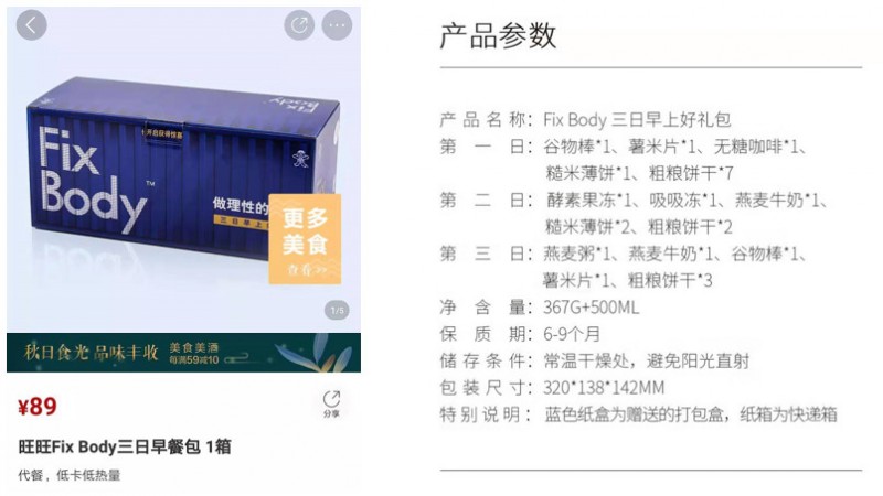对于旺旺而言,Fix Body带来的不仅是产品线的丰富,还有更高的客单价。在小米有品上,1箱Fix Body三日早餐包定价为89元,也就是平均一顿早餐的价格将近30元,若作为日常代餐,显然不是一般消费者能够负担得起的。
