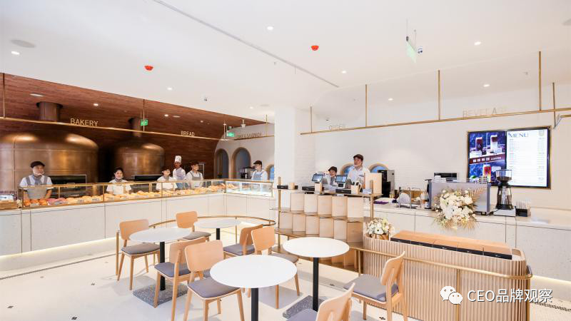 光明悠焙在空间设计上更时尚新潮,店内设置了各种面包西点的展示柜。在体验上,悠焙共分为面包窑烤区、水吧区、堂食区、社交厨房四大独立区域,其中社交厨房可随时变身为烘焙体验空间或会议空间。