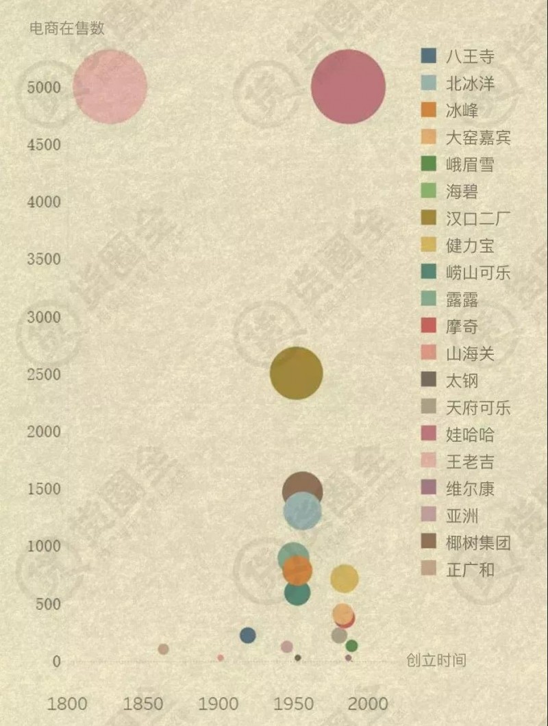 我们找到最老的饮料品牌是王老吉,诞生于1828年。整体来看,这些老牌饮品集中在20世纪50年代和80年代。