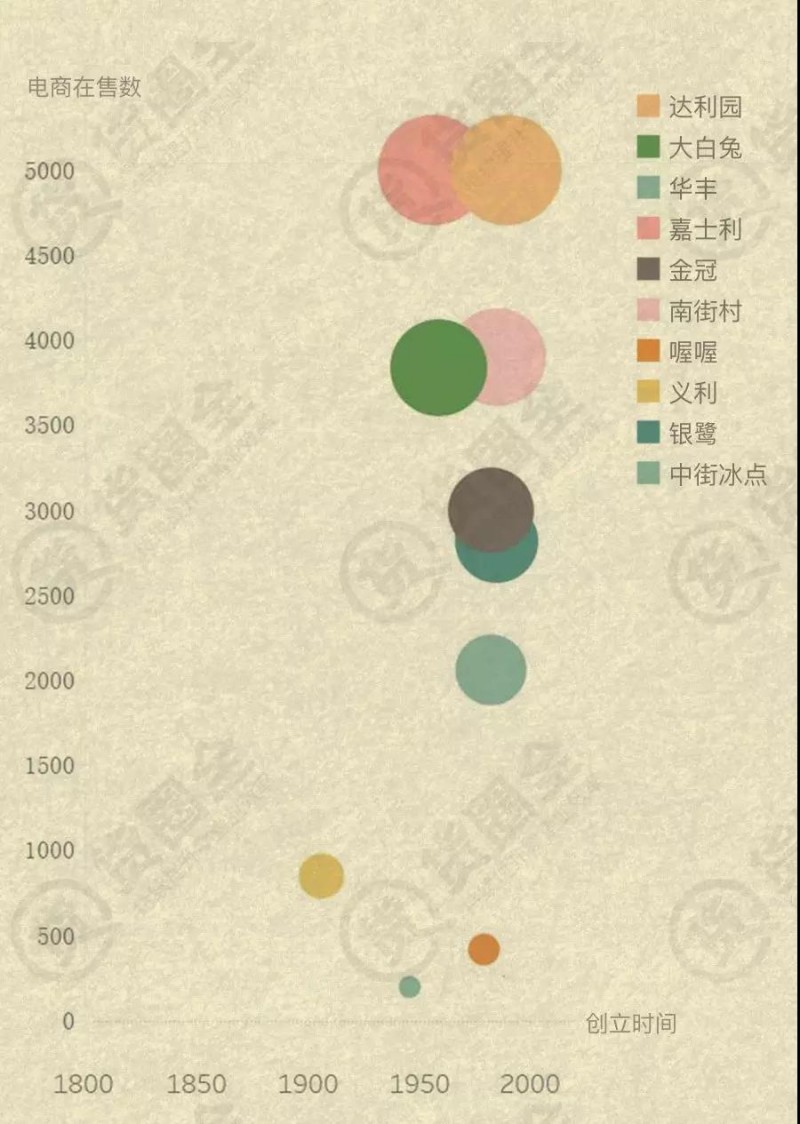 相较于饮料,食品产品的流动、传播性要强的多。嘉士利的饼干、华丰的方便面,在往北的市场经常可以看到。出自上海的奶糖品牌大白兔和喔喔,也是家喻户晓。