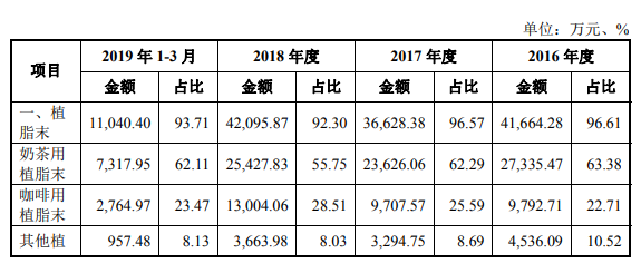 根据招股书,植脂末为佳禾食品的主要产品。2016至2018年以及2019年一季度,植脂末产品为佳禾食品创造了大部分营收,占主营业务收入的比重分别为94.64%、91.65%、85.94%和86.07%。