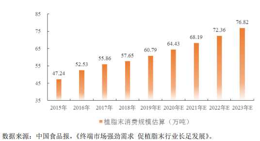 根据中国食品报发布的统计数据,2018年,我国植脂末产品的消费量为57.65万吨,预计2023 年,我国植脂末产品的消费量将进一步增加到76.82万吨,复合增长率将达到5.91%。