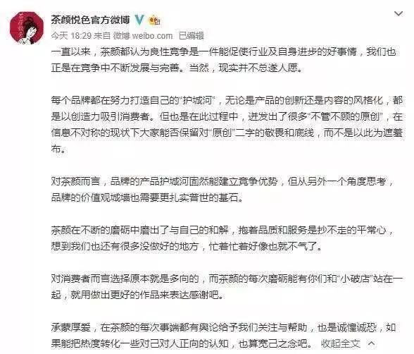 随后茶颜悦色微博发文疑似回应此事,称良性竞争是一件能促使行业及自身进步的好事,但现实总不遂人愿,“每个品牌都在努力打造自己的‘护城河’,但也是在此过程中,迸发出了很多‘不管不顾的原创’,在信息不对称的现状下大家能否保留对‘原创’二字的敬畏和底线,而不是以此为遮羞布”。