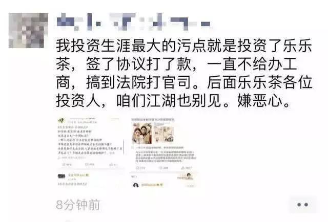 有媒体报道,此次抄袭风波后,一名乐乐茶的投资人在朋友圈表示,“投资生涯最大的污点就是投资了乐乐茶,签了协议打了款,一直不给办工商,搞到法院打官司。”