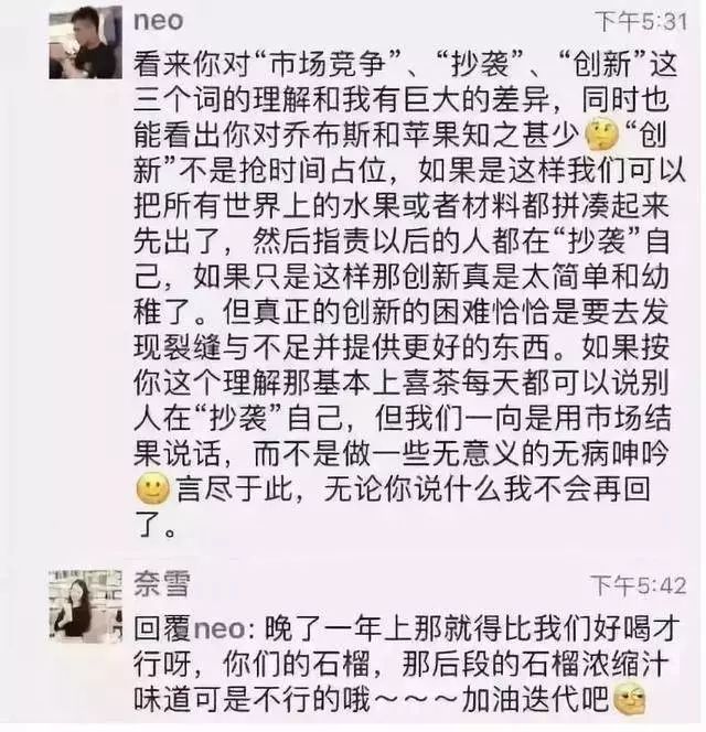 2018年,奈雪的茶的创始人彭心曾在朋友圈怼喜茶抄袭,她提到:“抄完奈雪的芝士草莓,又抄霸气蜜桃,抄霸气黑提,又抄霸气石榴,再来抄软欧包。除了芝士草莓是在奈雪上了四个月之后上的,其他都是隔了一年跟着奈雪回归产品,”