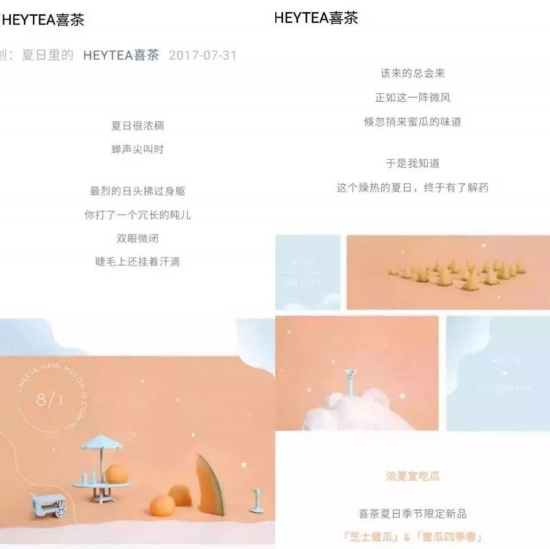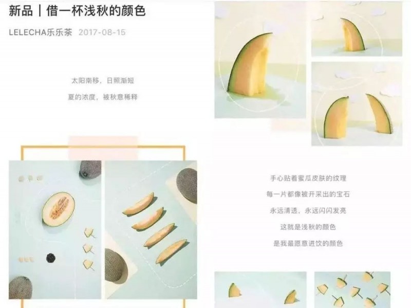 还有喜茶和乐乐茶推出的新品配图和文案,使用了相似的哈密瓜元素,让人“脸盲”。