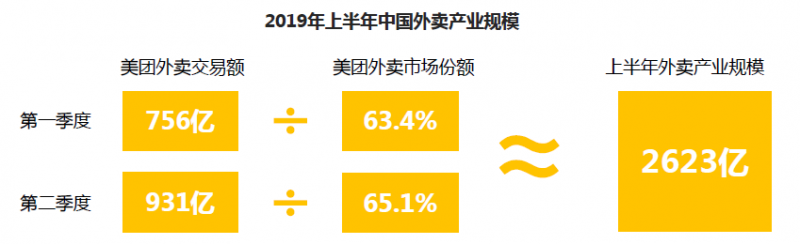 根据美团公布的财报数据,美团外卖第一季度、第二季度交易额分别为756亿元和931亿元,结合市场份额数据综合判断,2019年上半年中国外卖产业规模约为2623亿元。