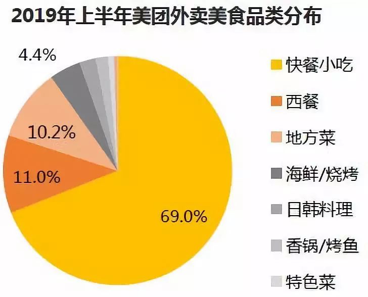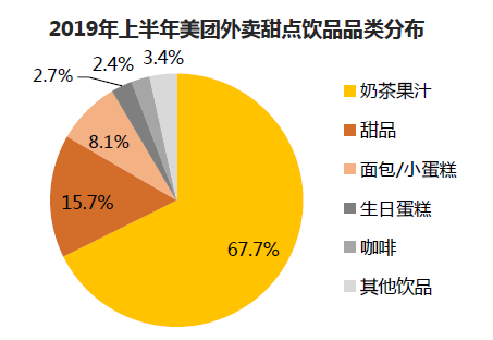 2019年上半年快餐小吃在美食品类中占比高达69.0% ,其次为西餐、地方菜、海鲜烧烤等;甜点饮品方面,奶茶果汁、甜点、面包/小蛋糕是主要消费品类。