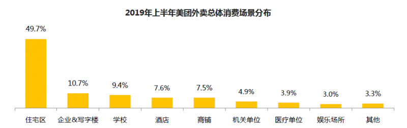 外卖TOP3销售场景为住宅、企业&写字楼、学校,其中住宅消费高于其他场景,占比高达49.7%
