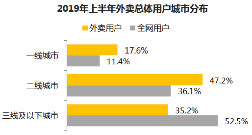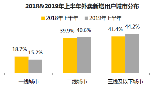 外卖目前在一线和二线城市强渗透,在三线及以下城市的渗透需要加强。从2019年上半年外卖产业新增用户数据来看,一线城市新增用户占比下降,二线、三线及以下城市的占比上升,其中三线及以下城市的占比达到了44.2%。