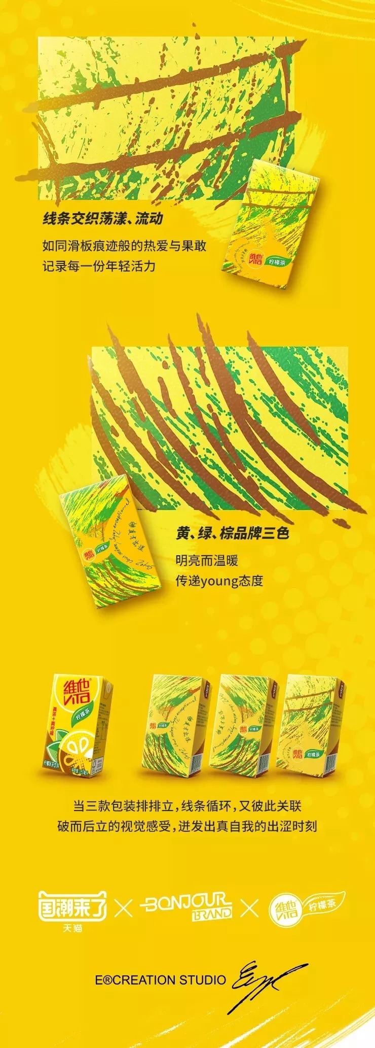 滑板在街头划出的痕迹,作为视觉元素用在包装上居然很带感!出自法国设计师 Eugène Riconneaus 的这款包装,是不是带着股年轻酷酷的 Feel?!红色碰撞黄色、绿色、棕色,让色彩显得更为活泼。三款独立的包装,互相区隔又有联系,摆在一起毫无违和感。