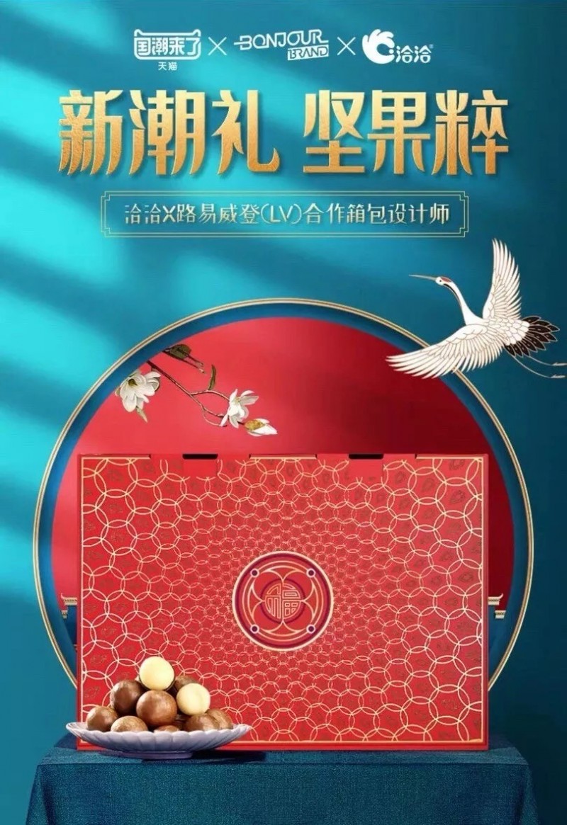 洽洽与 LV 合作设计师 Vincent Du Sartel 推出三款包装礼盒:洽洽年货节礼盒、洽洽皇葵罐装礼盒、洽洽小黄袋每日坚果礼盒,并与飞跃品牌共同携手 LV、香奈儿合作设计师 Eric Bongiovanni,共创跨界新品“东鞋西渡”潮鞋。