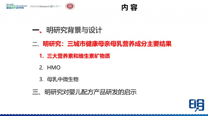 我今天讲的内容主要是明研究中涉及母乳营养成分,包括三大营养素尤其是蛋白质,以及维生素和矿物质,还有母乳低聚糖和母乳中的微生物这些方面的研究。
