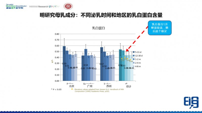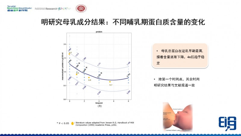 当然这个研究结果有很多人也发现了,我们跟其它的参考文献的结果基本上都是一致的。只有一个点和其他参考文献不一致,就是在第一个时间点上,中国母亲的母乳中的总蛋白含量是低于国外的。