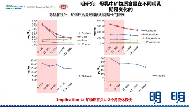 我们再看母乳当中的矿物质,除了锰和铁以外,其他的矿物质的含量基本上是随着泌乳期的延长而降低,我讲的含量并不等于总量,是指含量的降低。