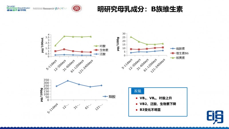 再看母乳当中的B族维生素随着泌乳期延长的变化情况,B1、B6和叶酸有点上升,但B2、泛酸和生物素都有点下降。