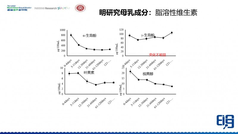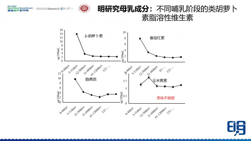我们看到α-生育酚、叶黄素、视黄醇是随着泌乳时间延长而降低的,但是γ-生育酚是相对稳定的。