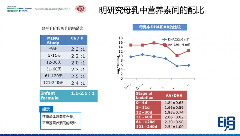 这张图你可以看到,中国健康母亲的母乳中,钙磷比是大于2 : 1的,ARA和DHA的比例随着分泌时间的延长而增加的,基本也都是2 : 1左右这个范围。