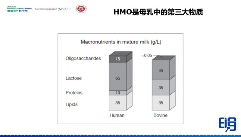 现在可能大家都知道,HMO是母乳中的第三大富含成分。初乳当中含量大概能够达到20-25g/L,成熟乳也可以达到5-15g/L,也就是说蛋白质的量还没有它高。