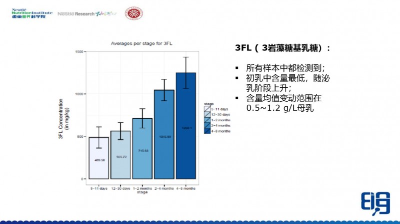 第二个是3岩藻糖基乳糖(3FL),它的含量是在0.5-1.2g/L左右,但是它的变化反过来了,是随着泌乳的时间延长而逐渐增加的。