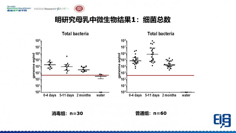 研究结果非常明显的看到,消毒剂组的母乳当中的含菌量也仍然在104/mL-105/mL ,当然普通组会更高一点,106/mL 左右。
